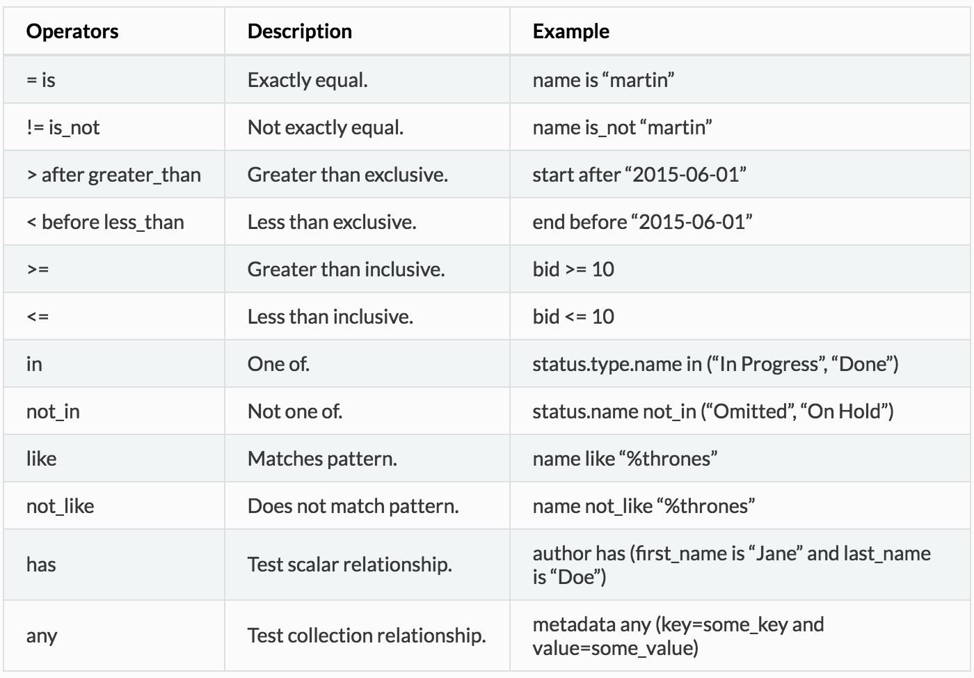 When filtering on relationships, the conjunctions has and any can be used to specify how the criteria should be applied. This becomes important when querying using multiple conditions. The relationship condition can be written against the following form: