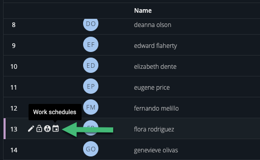 Opening the sidebar for a user will also display their Work Schedules at the bottom of the user’s info tab.