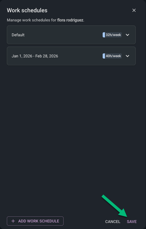 Once all work schedules have been set up for the user, click Save to apply the changes.