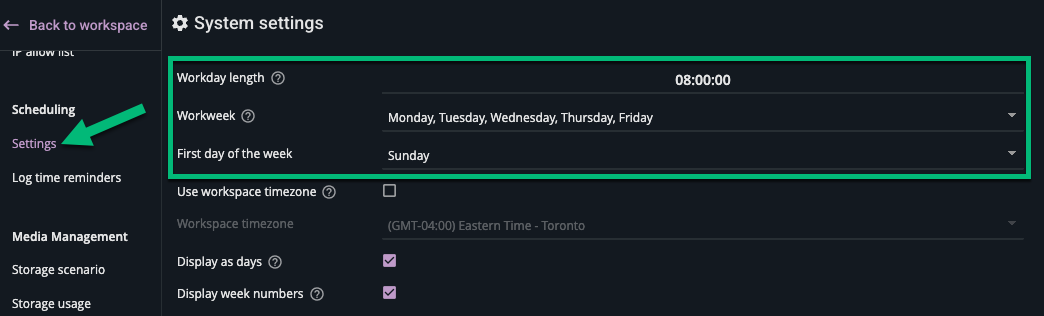 A global configuration for the workday length, and days included in your work week remains available in System Settings > Scheduling > Settings: