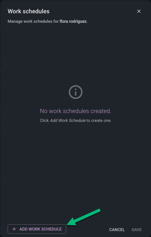 A dialog window will appear with the option to Add Work Schedule. Click this button to modify the work schedule for the user.